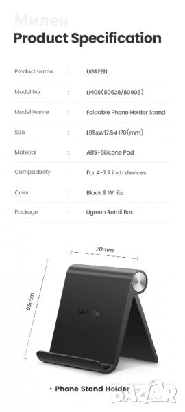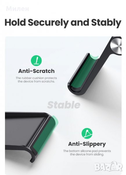 Стойка за таблет, телефон, която се позиционира върху бюро, маса и други. Тази поставка има регулируем ъгъл на наклон в 10 различни позиции с възможност за вертикално и хоризонтално позициониране на устройството. Висок клас аксесоар Ugreen с доказан произход.