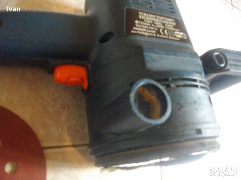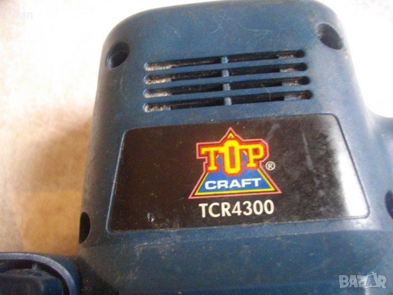 Описание на 430 вата немски Топ Крафт - професионален. Цена 159 лв. Хипер силен и мощен 430 ватов кръгъл ексцентър виброшлайф,профи модел на Топ Крафт.Марка и модел-Top Craft TCR 4300 . Производство-немско оригинално на концерна Haager,упоменато на маркировките. Машината е със запазен външен вид и работи добре.Няма искрене,вдига нужните обороти,има си добри ротационни и вибрационни трептения.Хипер мощност-430 вата,обороти- 6 000 - 11 000 В минута,регулируеми с регулатор.Автостоп на спусъка.Предна регулируема твърда и здрава дръжка.Дълъг конектор на отпадъчен прах,за директно скачване в торба за прах,или прахосмукачка.Работен плот-пита,кръгла,тип Велкро,с капацитет вписан на етикета-ф115мм.Велкрото е добро, самозалепващите елементи задържат здраво шкурката. Към машината има 1 бр. нова оригинална велкро шкурка,универсална зърненост-дърво-метал. ТЕЛ. ЗА КОНТАКТИ: 0 896782271.