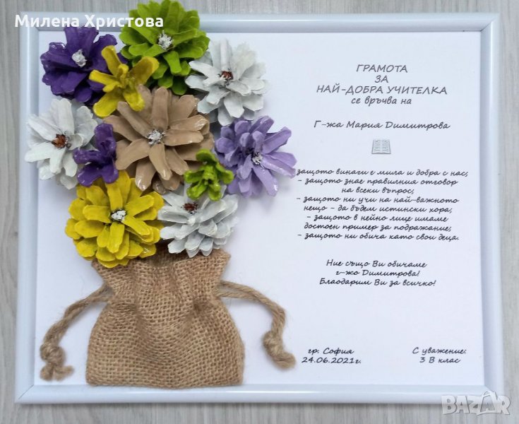 Грамота "Най-добър учител" с букет от шишарки → Обява 33148146