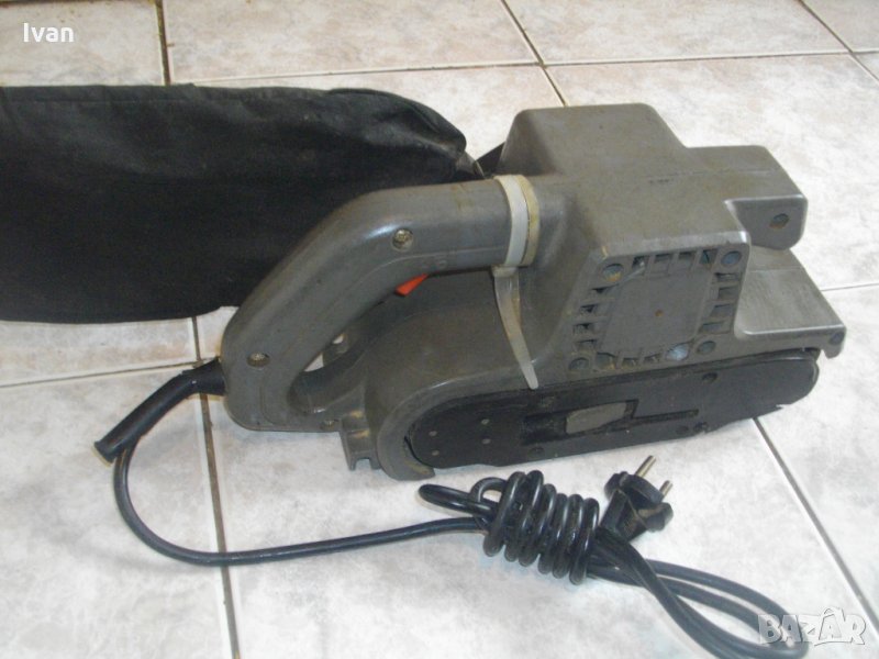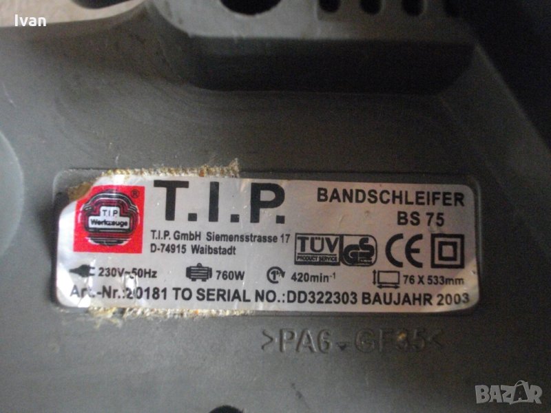 Описание на машина без торба- Машината е със забележка-работи много силно,мощно,бързо,вдига веднага максимални обороти,но има силно искрене на ниво четки или ротор,без да замирисва на изгоряло,дори и при продължително въртене.Цената на машината е съобразена със забележката по техническото състояние.Лентов шлайф.Производство - Германия. Машината е със запазен външен вид и техническо състояние-описано,по-горе.Работи силно,мощно,бързо,върти на сухо..Мощност-760 вата,лентов път скорост-420 метра в минута.За шкурки 76х533мм.Автостоп на спусъка.Дълъг конектор на отпадъчният прах.Четки-външни.Точна марка и модел-TIP BS75