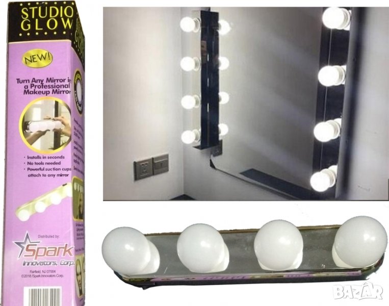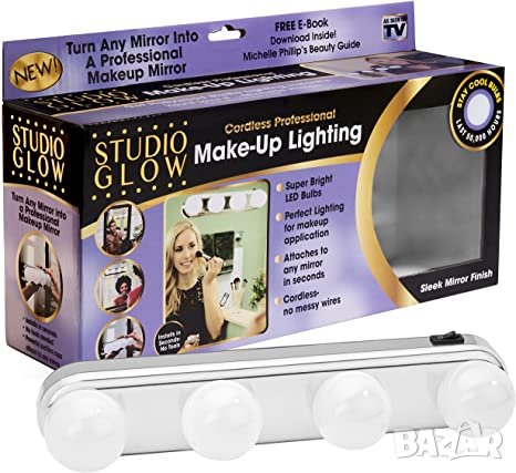 светлина на открито и на сянка, можете да бъдете сигурни, че ще изглеждате зашеметяващо, на закрито или навън! Три надеждни вендузи ви позволяват бързо и безопасно да прикрепите Studio Glow към всяко огледало или гладка повърхност. По този начин получавате цялата тази светлина точно там, където ви е необходима, осветявайки цялото си лице, но без шнурове, твърди щипки или фиксиращи елементи, които биха могли да повредят или дори да напукат повърхността на огледалото. Studio Glow се побира в чантата ви, перфектния начин да оправите грима си независимо дали сте в бар, в офиса или се приготвяте у дома пред любимото си огледало. Размери: 31 х 6 х 2.5 см.
