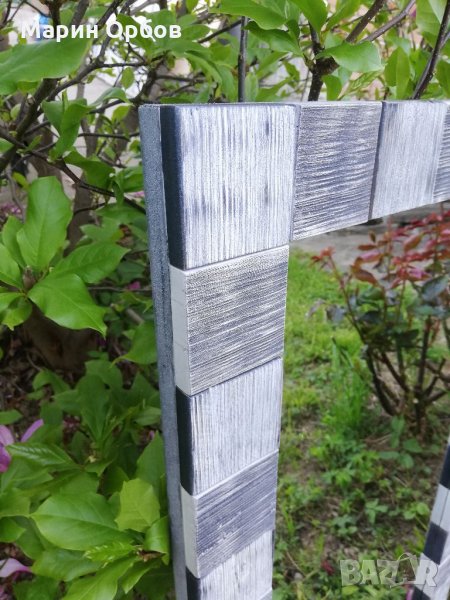 Огледалото е направено от букови квадратни елементи 70/70/15мм, оцветени с бяла основа с черна патина и черна основа с бяла патина.