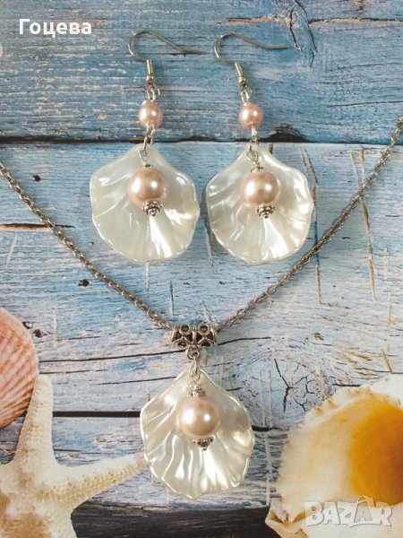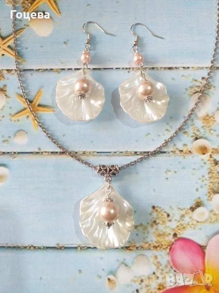 Красив комплект бижута с бледо розови кристални перли обгърнати в бяла нежна мида