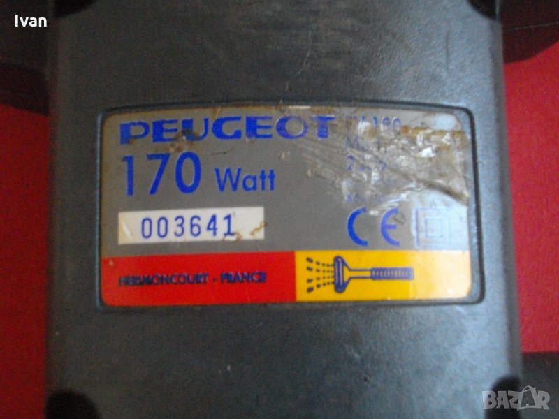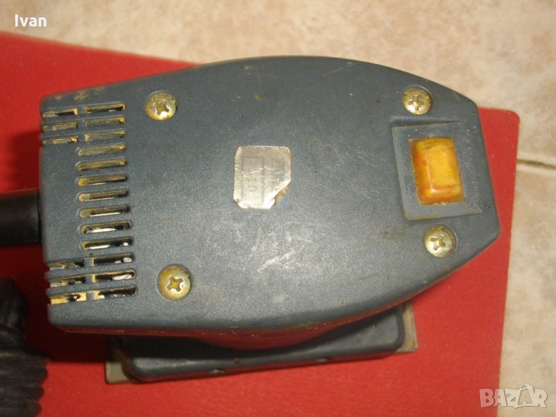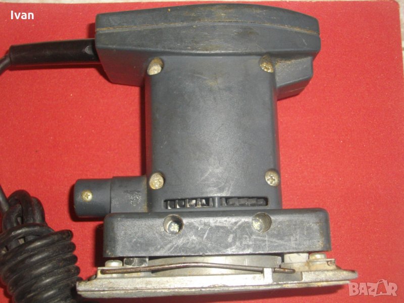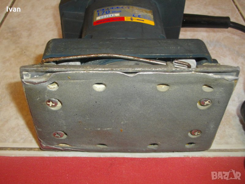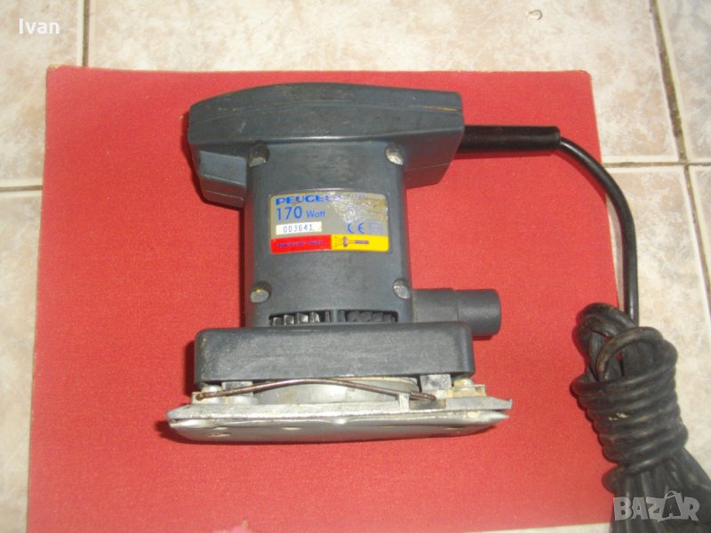 Пежо.Френско оригинално производство.Марка и модел-Peugeot PV190.Машината е с много запазен външен вид и отлично техническо състояние-работи много добре.Силна и мощна е.Мощност на мотора-170 вата,обороти-14 000 в минута.Размер на плота-80х130мм.Вакумен противопрахов пусков бутон.Дълъг конектор на отпадъчният прах.Работният плот е изцяло метален,олекотен,включително и кръглата голяма глава.Корпус-твърдосплавна трудно запалима бакелитова пластмаса.Захвата на шкурката е с металните стоманени телове-скоби.Към машината има поставена шкурка за метал.