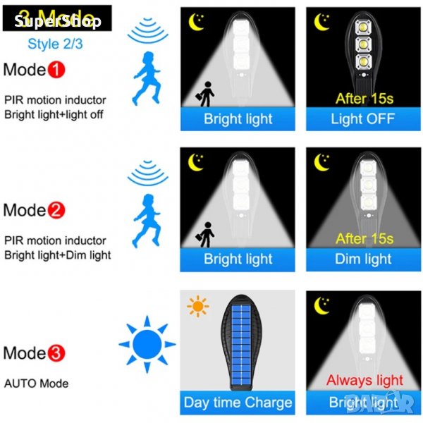 Тази интелигентна функция позволява на соларната лампа, захранвана от слънчева енергия, да спестява енергия, когато никой не е в обхват и няма необходимост от светлината, което означава много по-дълго време на работа.