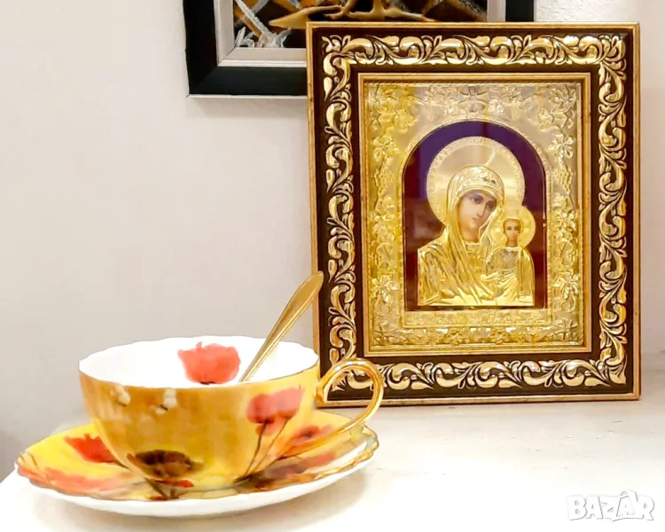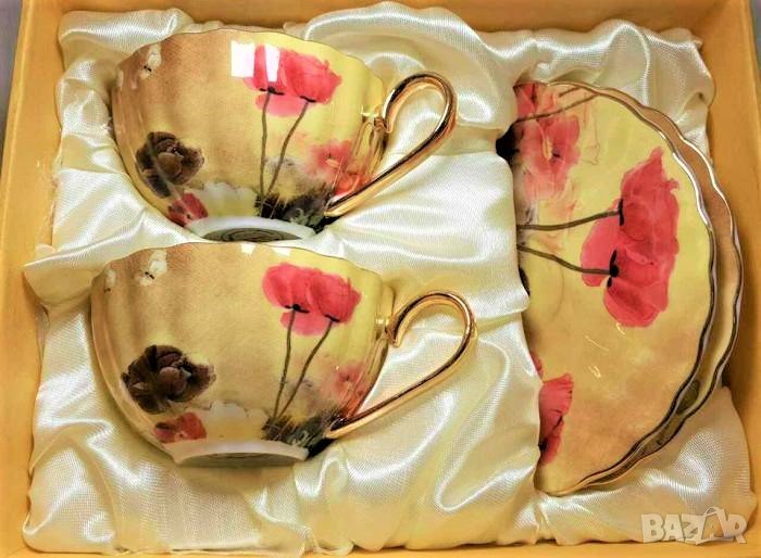 Красив комплект "Разцъфнал мак" чаша и чинийка костен порцелан с цялостен декор от макове и пърхащи пеперуци край тях .