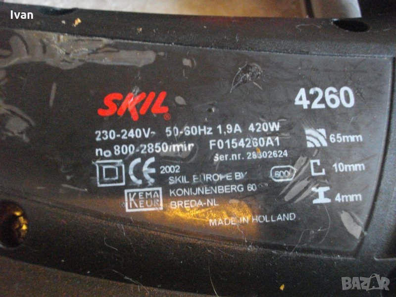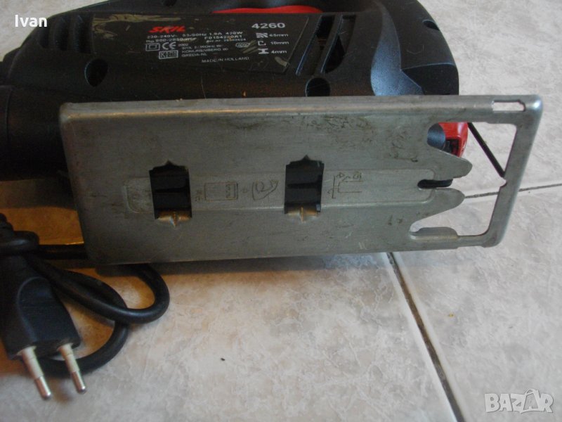 НАЛИЧНО. Описание на 420 ватово черно профи холандско зеге - Skil 4260. МАШИНАТА СЕ ПРЕДЛАГА ЗА ЧАСТИ ИЛИ ЗА РЕМОНТ-НЯКОЙ ДА СИ Я ОПРАВИ.РАБОТИ СИЛНО И МОЩНО,НЯМА ИСКРЕНЕ,ВДИГА ОБОРОТИ,НО НА ГЛАВАТА ЛИПСВА СЪЧМАТА,КОЯТО ЗАДЪРЖА ДВИЖЕНИЕТО НА НОЖА-СИСТЕМАТА КЛИК-КЛИК НЕ РАБОТИ ЗА ЗАДЪРЖАНЕ-НОЖА ИЗПАДВА СВОБОДНО.Вертикален прободен трион,професионален модел на Скил.Холандско оригинално производство.Марка и модел-Skil 4260.Машината е като нова-почти неизползвана.Работи много добре-силно,мощно.Мощност на мотора-420 вата,1,9 ампера,обороти-от 800 до 2850 в минута,регулируеми с 6 степени.Двустранна авто защита на спусъка пре работа.Дълбочина при рязане в дърво-65 мм,в алуминий-10 мм,в желязо-4 мм.Наличие на дълъг конектор на отпадъчният прах за директно скачване в прахосмукачка или торба за прах.Система клик-клик на работният плот за бързо вадене-с 1 движение-за снемане на плота при работа в трудно достъпни места.Машината е клас Турбо-за праволинейно и обикновено ряззане.Система клик клик за бърза сменяемост на режещият нож.Забележка-поставях от двата вида ножове с Т образен и У образен захват-не стоят добре-излизат.Системата работи за ножа,придвижва се назад при поставяне,но ножа излиза.