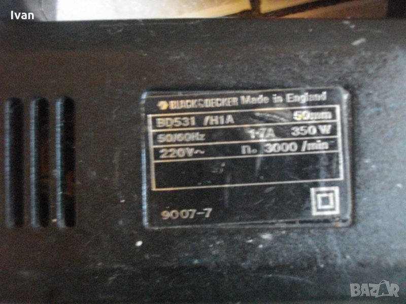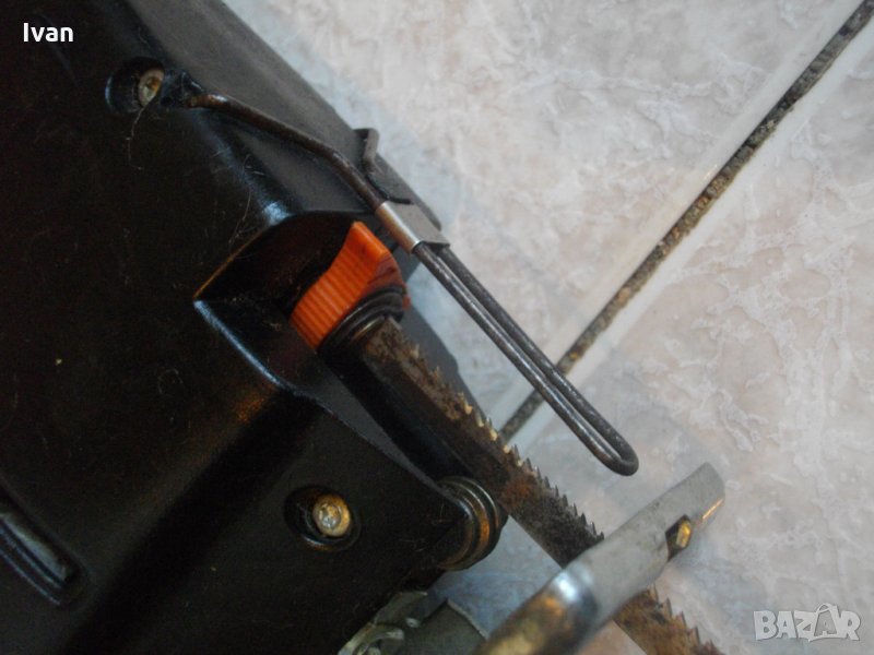 Описание на английско черно 350 вата зеге -1,7 ампера - Black Decker. Силно и мощно 350 ватово зеге-вертикален прободен трион,модел на Блек Декер.Английско оригинално производство. Машината е със запазен външен вид и отлично техническо състояние.Работи много добре.МАРКА И МОДЕЛ-Black Decker BD531 H1.Бърза и ефикасна при работа.Мощност на омтора-350 вата,1,7 ампера,обороти-3000 в минута,постоянниТаблица с графики на дълбочина при рязане в различини материали и видове ножове за приложение.Дълбочина при рязане в дърво-до 50мм,алуминий-8мм,желязо-3мм,пластмаса-35мм.Автостоп на спусъка-шпиндел.Прозрачен предпазител на главата.Захват глава на ножа-2 обикновенни болта.Към машината има 1 брой оригинален бързоскоростен режещ нож-трион за дърво.