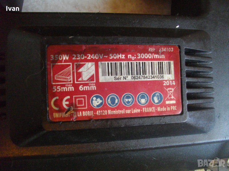 Описание на 350 вата черно зеге - английско-с английски щепсел, и бързосменяема глава.Професионалин модел - Wickes. Почти нов вертикален прободен трион-зеге.Английско производство, с оригиналният си английски щепсел.Марка и модел-Wiskes Powertool Range Jig Saw 350W.Машината е като нова-с много запазен външен вид и отлично техническо състояние.Работи много добре.Мощност на мотора-1,6 ампера,350 вата,3400 оборота.Дълбочина при рязане-до 55 мм в дърво,в желязо-до 4мм.Автостоп на спуъка.Масивен метален дебел плот от хромирана стомана.Глава с клик-клик систама за бърза сменяемост на режещият нож.За ножове-триони с Т образен захват.Към машината има 1 брой бързоскоростен режещ нож-трион,за дърво,
