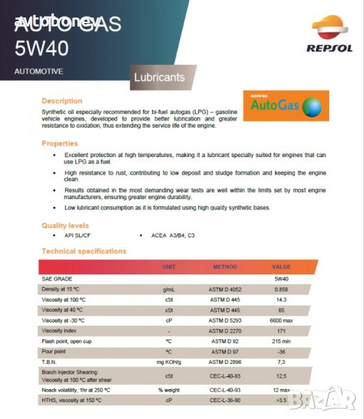 REPSOL AUTO GAS 5w40 е синтетично моторно масло, разработено специално за двигателите работещи на газ LPG и CNG.