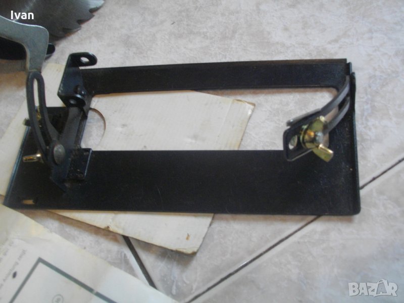 Описание на приставката без книжка, и без плот. Описание на ризидава зелена немска приставка - Съвсем нова неупотребявана приставка ръчен циркуляр за Бормашина.Немско оригинално производство.Марка на приставката-Hanseatic.За дискове размер-ф150мм.На приставката има поставен нов оригинален на марката режещ диск за дърво,с лого.Приставката е изцяло метална,включително и дръжката.Без плот е,с метален предпазен автоматичен ограничител,при работа.Захват-стандартен шестен.Приставката е в отлично техническо състояние.