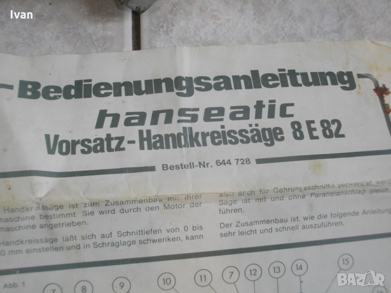 Описание на приставка с плот и книжка указания. Съвсем нова приставка ръчен циркуляр,за бормашина-дрелка или други машини със снемащ се патронник.Приставката е универсална,професионален,изцяло масивен,метален модел на Хансеатик.Немско оригинално производство.Марка и модел-Hanseatic 8E82.Захват към бормашина-посредством вградена шестенна втулка,диаметър 16мм.Ааптора не е включен към приставката.Приставката е изцяло от метал,без пластмаса по нея.С поставен нов оригинален немски режещ диск за дърво-размер ф140мм.Оригиналната листовка с указания и схеми е налична,на немски език.Там е упоменато за кои машини стават немските приставки на марката-за Hanseatic,AEG,Bosch,Elite,Bullcraft,Uniropa,Kress,Black Decker-тип 25-10 и тип 25-13.Наклон на плота на приставката-до 45 градуса .Плота не е поставен към приставката.
