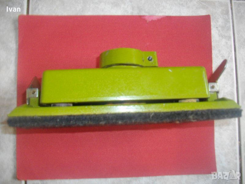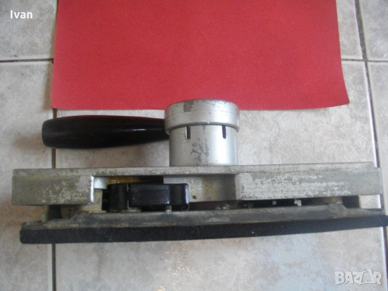 Виброшлайф правоъгълен,за поставяне към бормашина-дрелка.Приставката е старо,високо качествено на АЕГЕ-Марка и модел-AEG SS717.Производство-оригинално немско. Много запазен външен вид и отлично техническо състояние.Размер на плота за поставяне на обикновенна шкурка-225х110 мм.Захват-странични метални стабилни щипки,по цялата ширина на приставката.Покритие на работният плот-масивна дебела 10 мм инпрегнирана гумирана повърхност,за обиране на вибрациите и против разкъсване на шкурката.Наличие на оригиналната снемаща се дръжка към приставката.Захват на приставаката-за машини бормашини-дрелки на марката AEG.Към приставаката има 1 бр.голяма двойна шкурка-нова,холандска,марка Kingstone-дребнозърнест черен пясъчен абразив р400-за съвсем финно шлайфане.