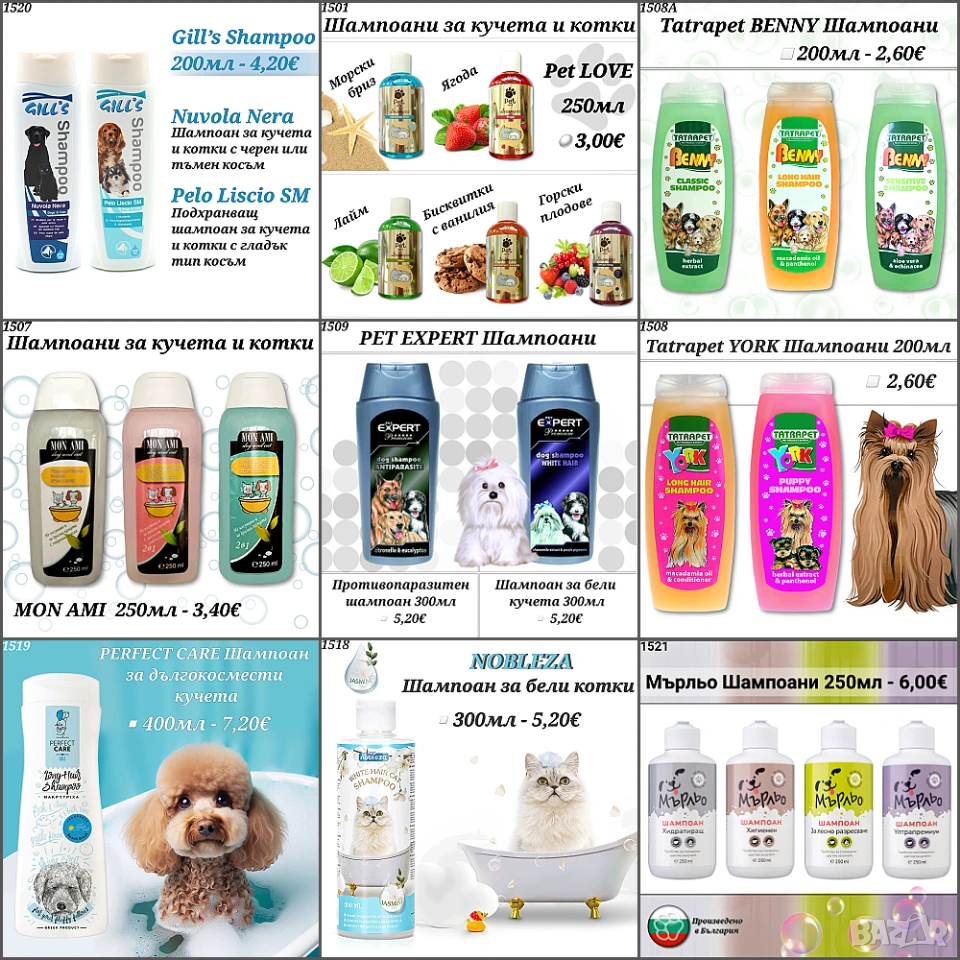 Шампоани за кучета и котки. Противопаразитен шампоан. Репелент. Парфюм за куче. Шампоан за бяло куче