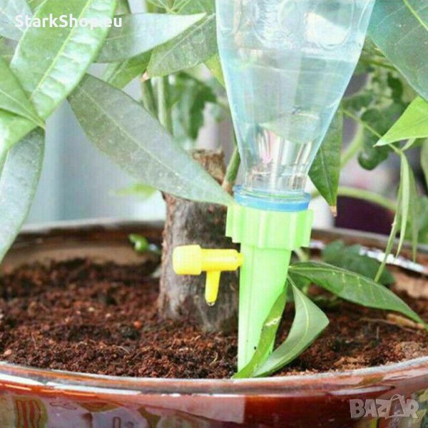 Поставете пластмасовата част вътре в почвата и поставете пълна бутилка вода върху пластмасовата част. Използвайте регулиращия клапан, за да контролирате количеството вода, което отива в почвата.