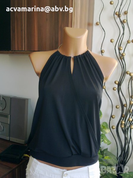 Ефектен черен топ от еластична материя.На врата е с метален обръч , който се откопчава.Отлично състояние , без следи от носене.