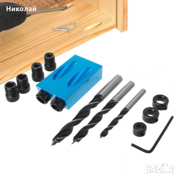 Уред за пробиване на отвори под ъгъл. Пълен комплект : шаблон , 3 бр. свредла за дърво Ф6 Ф8 Ф10, водачи , ограничители и