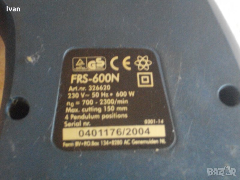 Ferm FRS-600N.Машината е с много запазен външен вид и ТЕХНИЧЕСКО СЪСТОЯНИЕ-МОТОРА РАБОТИ МНОГО ДОБРЕ,ОБОРОТИТЕ СЪЩО,НЯМА НИКАКВО ИСКРЕНЕ НА НИВО ЧЕТКИ И РОТОР.ОСТА КЪМ ГЛАВАТА ОТ РОТОРА ИМА НЕЩО ИЗВАДЕНО ИЛИ СКЪСАНО.ОСТА С НОЖА СЕ ДВИЖИ СВОБОДНО ПОЛОВИН ОБОРОТ НАЛЯВО-НАДЯСНО,ПРИ РАБОТА И НА СУХО.МАШИНАТА РАБОТИ И РЕЖЕ И ТАКА,НО ЗА БЕЗОПАСТНОСТ ТРЯБВА ДА СЕ ОПРАВИ ТОВА-ножа ,,играе" няколко сантиметра наляво-надясно при рязане.Бърза е,силна и мощна.Мощност на мотора-600 вата,обороти-700-2300 в минута,регурируеми с 6 степени.Максимална дължина за поставеният нож-трион-150мм. 3 положения на наклон на плота. Автостоп блокировъчна защита на спусъка-шпиндел. Захват на главата-шестенен болт шестограм. Регулация на дължината при рязане,посредством металния ограничител отпред.Тегло на машината-2,5кг.