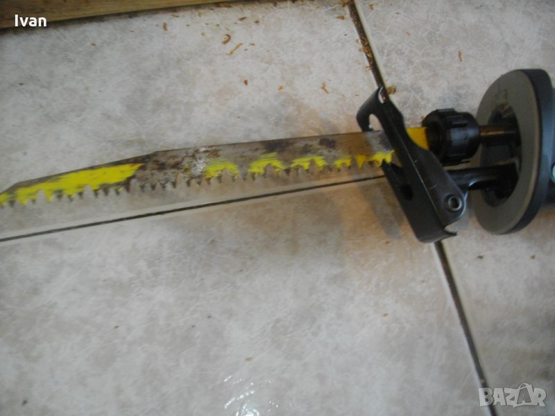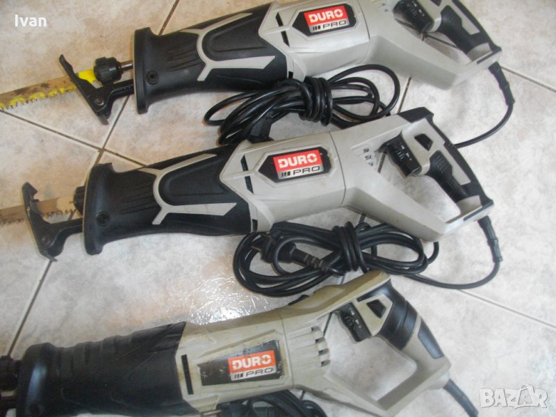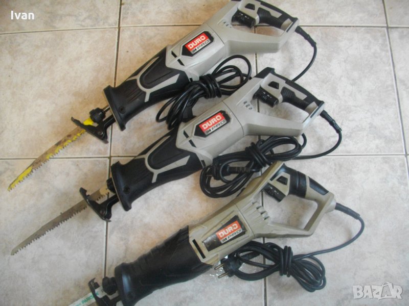 Описание на трион първи на общата снимка, отгоре - надолу -Duro DES 850-1 . Голям мощен и силен 850 ватов саблен реципрочен трион-ножовка, профи модел на Дуро. Марка и модел - Duro DES 850-1. Производство - оригинално немско 2016 г.- Germany, упоменато на маркировките. Машината е със запазен външен вид и техн.състояние - ротора работи добре, понякога не се задвижва оста към главата - един-два пъти тръгва силно и мощно, когато се спре - не търгва. Като се натисне главата назад - тръгва винаги. Мощност на мотора - 850 вата, обороти - 500-2 800/минута, регулируеми посредством регулатор, разположен върху спусъка.Автостоп на спусъка. Функция въртене на корпуса, за рязане под ъгъл. Гумирано противоуедарно, инпрегнирано покритие на предната част на корпуса. Регулация дълбочина рязане. Глава - система клик-клик, бърза сменяемост на режещият нож - с две движения. Над главата има прожектор, работещ при включване в захранването. Към машината има 1 бр. оригинален режещ дълъг нож за дърво, чапраз зъби, швейцарско производство.Дължина на ножа - 230 мм.