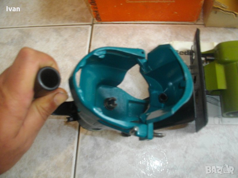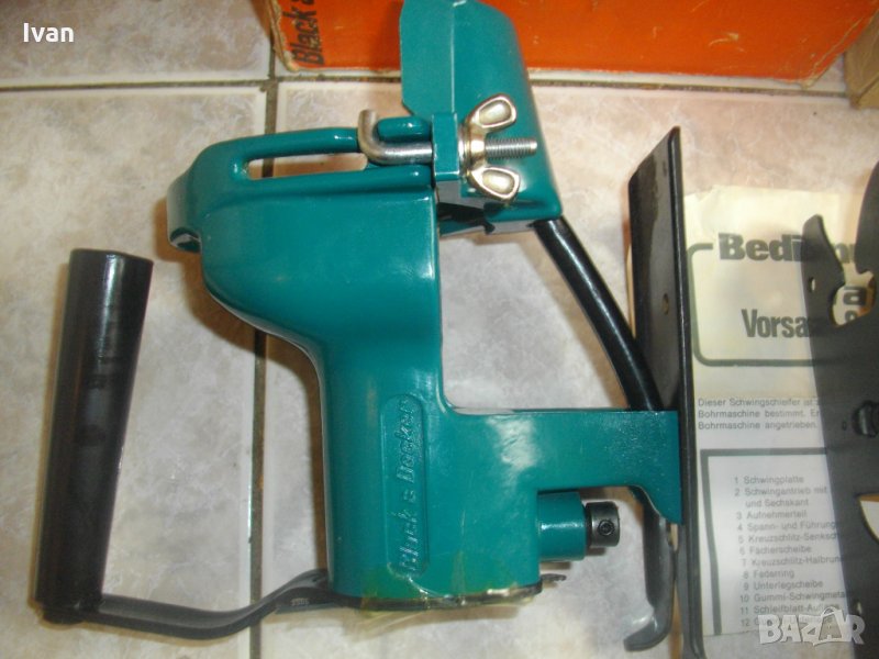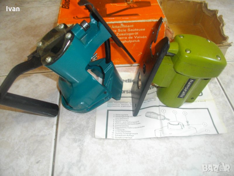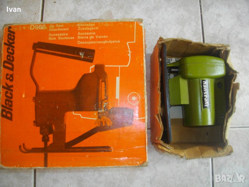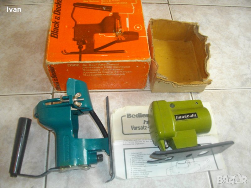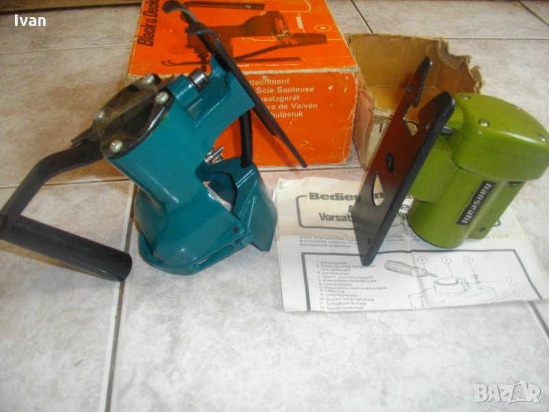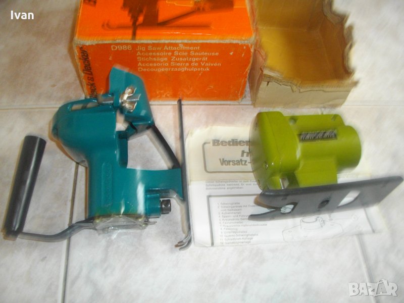 Описание на синя френска приставката зеге - вертикален прободен трион Блек Декер. Цена 79 лв. Съвсем нова приставка зеге-вертикален прободен трион,професионален модел на Блек декер.Приставката е за бормашини-дрелки на марката Блек декер,старите модели-сините и оранжеви 300-550 ватови.Приставката е оригинално френско производство.Марка и модел-Black Decker D986.Приставката е професионална,изцяло масивна,желязно,висококачествена изработка.Глава-стандартна,за ключ шестограм-малък.Захват-стандартен,за стандартни ножчета-триони с U образен захват.На приставката има поставен нов оригинален режещ нож-трион за дърво,Шведско оригинално производство,марка Wolfcraft.Приставката е с масивна удобна желязна дръжка,с пластмасово нехлъзгащо се покритие.Приставката е прибрана в оригиналната си френска картонена опаковка.