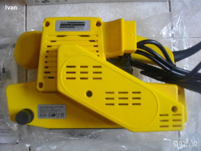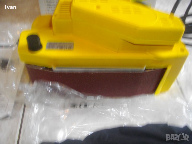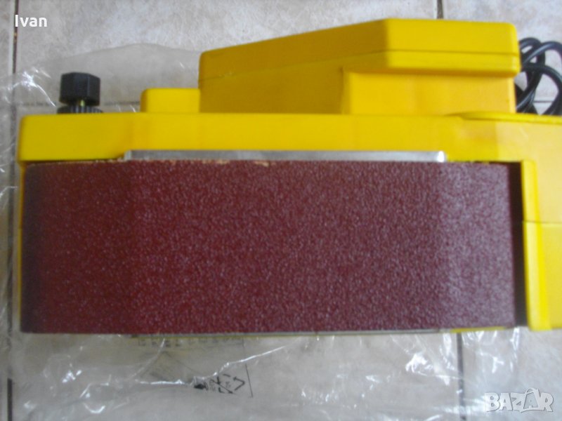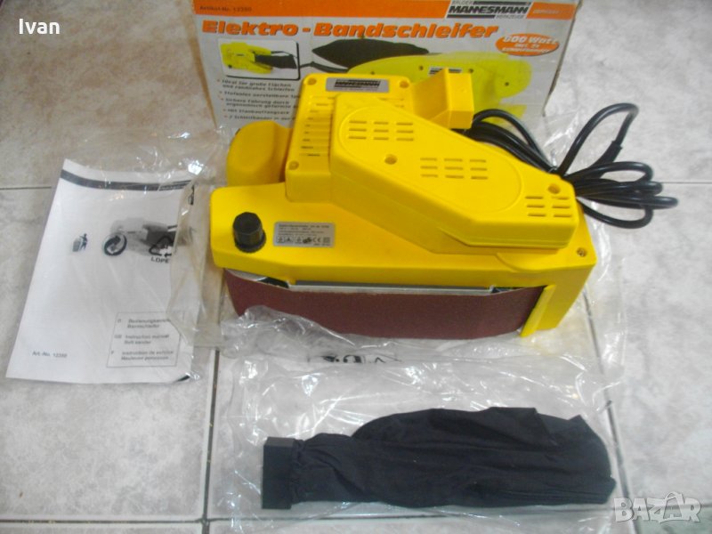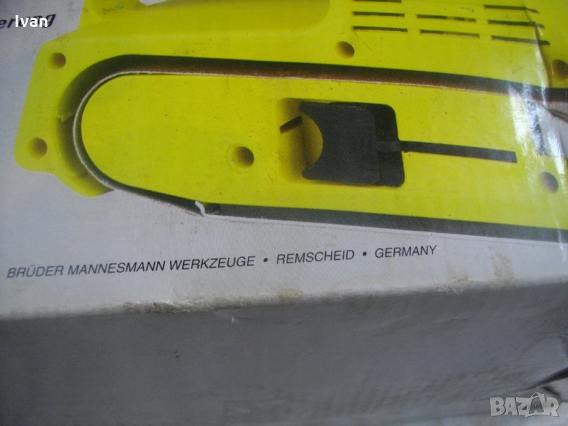 лентов шлайф, профи 800 ватов, силен и мощен модел на немският концерн Manesmann. Марка и модел на машината - Manesmann 12350. Производство - оригинално Германия 2003г. Машината е съвсем нова, неизползвана ,в отлично техн.състояние. Работи отлично. Мощност на мотора - 800 вата, скорост на лентата - 360 м/мин. За големи шкуркове ленти размер 75х533мм. Голямо време наработа с 1 пуск - 20 мин. Автостоп на спусъка. Равна горна повърхност за обърнат стоеж на машината, при работа. Гумиран заден амортисьор, предна ролка- с пластмасово релефно покритие. Регулатор право движение на лентата. Към машината има 1 бр. нова оригинална немска шкуркова лента - едър зърнест абразив - А60.налична оригиналтата платова торба с цип, за конектора на отпадъчен прах. Налични книжки указания за употреба, на небългарски езици. Комплекта е прибран в оригиналният немски твърд кашон - картонена опаковка.