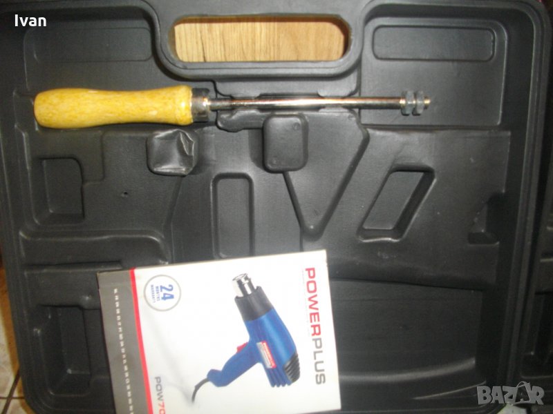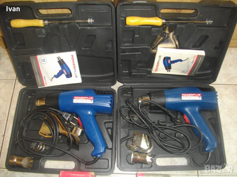 Съвсем нов комплект пистолет за топъл-горещ въздух,мощен 1600 ватов професионален модел на Поуър Плюс.Белгийски оригинално производство. Марка и модел-Power Plus POW702.Машината е в отлично техническо състояние-работи много добре.Силно,мощно,бързо и ефективно.Мощност на мотора-1600 вата,2 степени,при 1000 вата-достига температура-380 градуса,при 1600 вата-до 500 градуса.Пълен комплект-6 броя различни приставки аксесоари и книжка указания за употреба на небългарски езици.Комплекта е прибран в оригиналният си твърдосплавен пластмасов куфар,с фабричното лого.