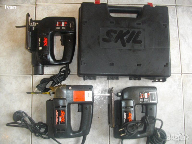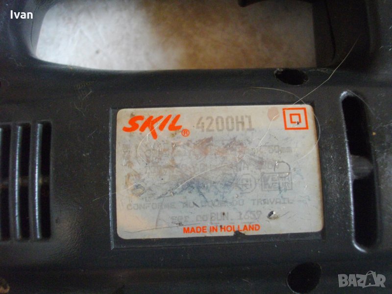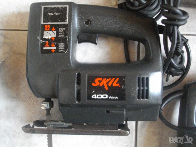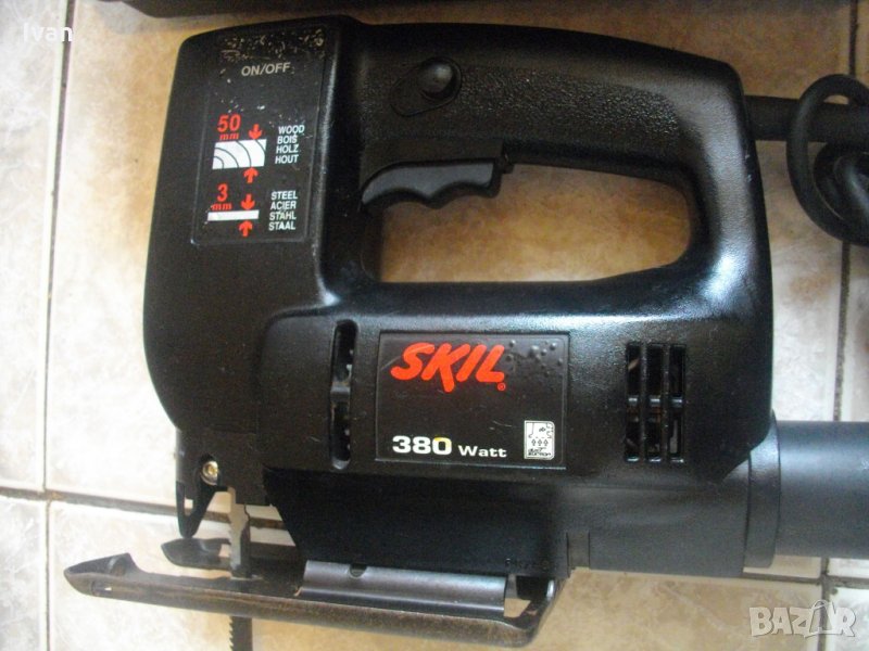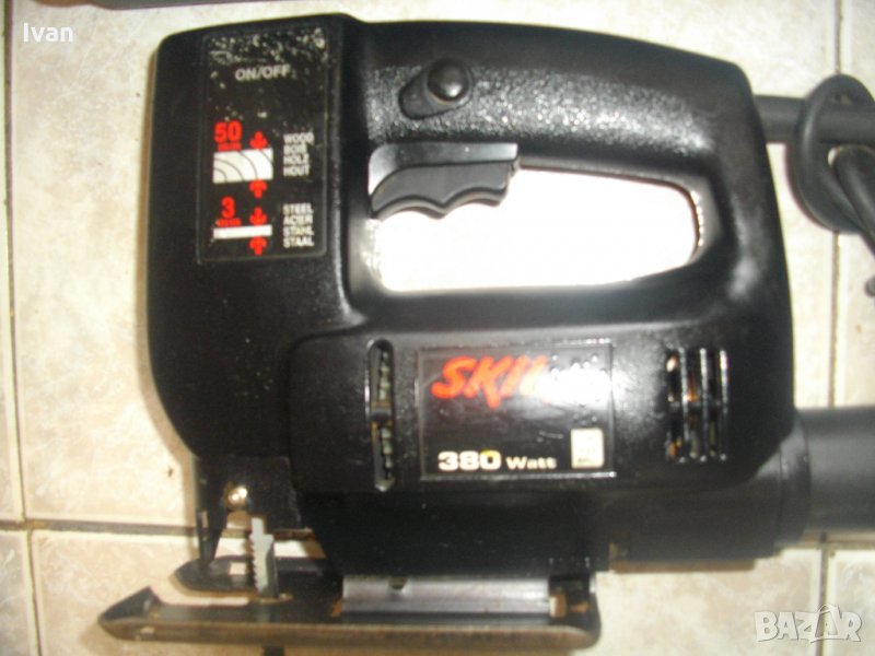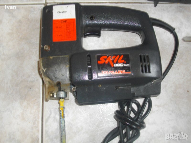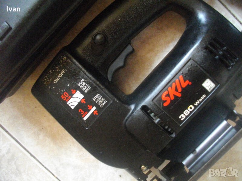 прободен трион,професионален модел на Скил.Холандско оригинално производство. Марка и модел-Skl 4200H1.С машината е работено, но е със запазен външен вид и добро техническо състояние.Мощност на мотора-380 вата,обороти-3500 в минута.Дълбочина при рязане в дърво-50мм,в желязо-3мм.Автостоп на спусъка-шпиндел.Прозрачен пластмасов предпазител на главата.Глава-изцяло метална,захват на ножа- обикновен болт.Наклон на плота-до 45 градуса. На машината има поставен оригинален шведски режещ нож за дърво.ЗАБЕЛЕЖКА по машината - няколко болта, които държат двете части на корпуса, са сменени с нормални болтове с гайка от другата страна.