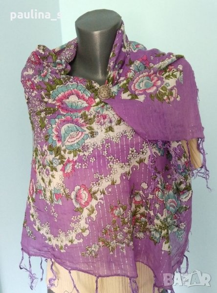 2️⃣ . Люляков шал в пъстър и весел флорален принт с метална нишка в сребърно от Индия, не е нов.