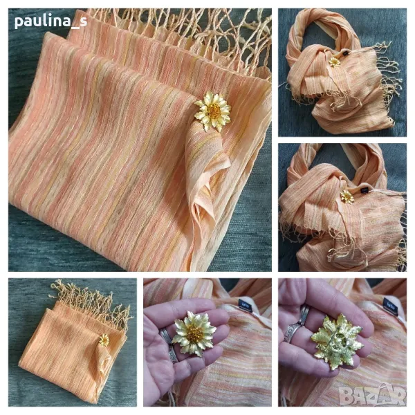 9️⃣. Колаж 3 - Дизайнерски шал "Kello" описание (3) - цена 19,99лв и винтидж руска брошка.