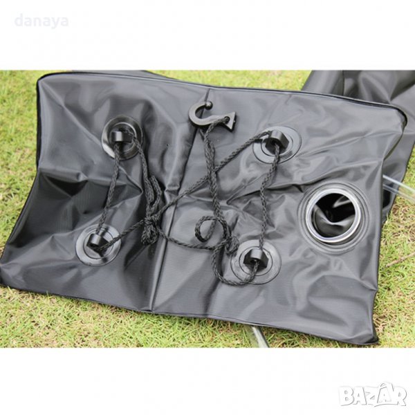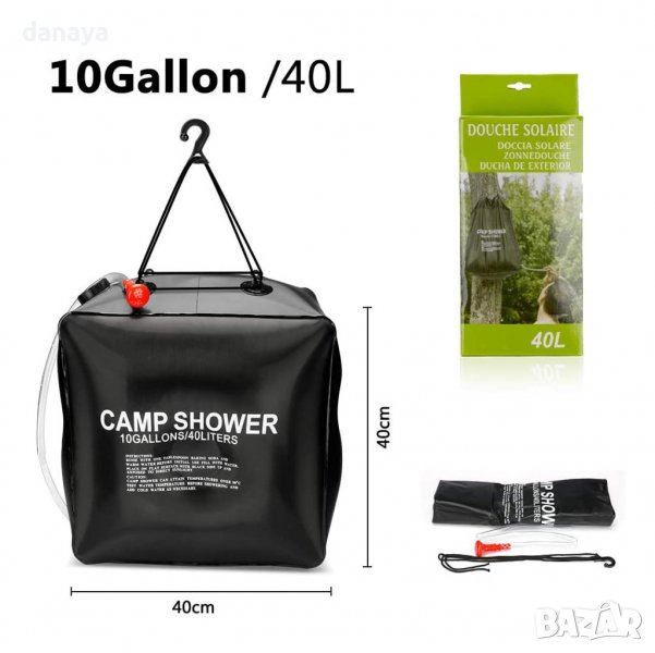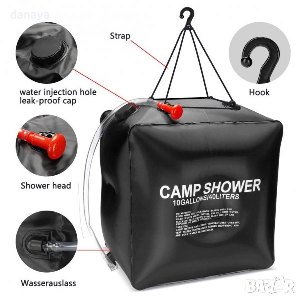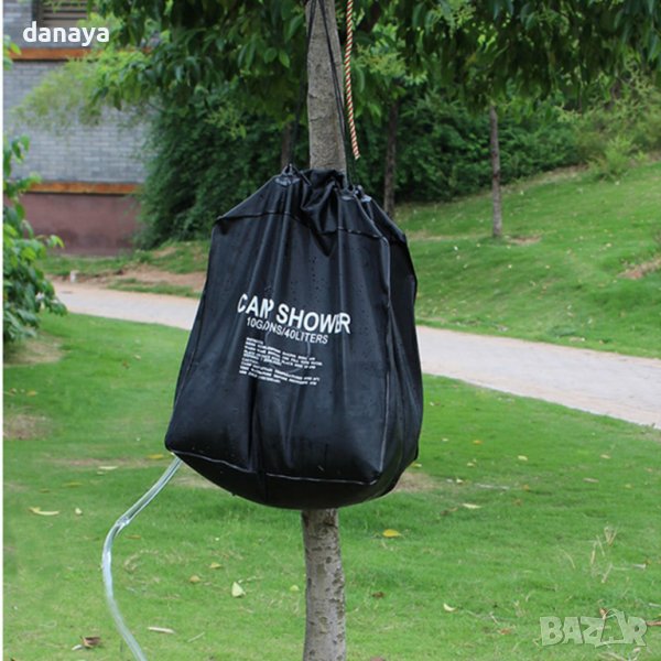 Преносим душ за къмпинг – идеално решение, където няма достъп до вода и електричество. Изработен от качествени материали. Когато е празен, душът е лек и заема малко място, може да се постави в раница. Капацитет – 40 литра. Черният цвят ускорява нагряването на водата в душа. Душът е идеален, когато сте на къмпинг, на полето, палатки, турнета, велосипедни пътувания, море, плаж и др. Може да се закачи на стабилно място – клон, тръба, издатина.