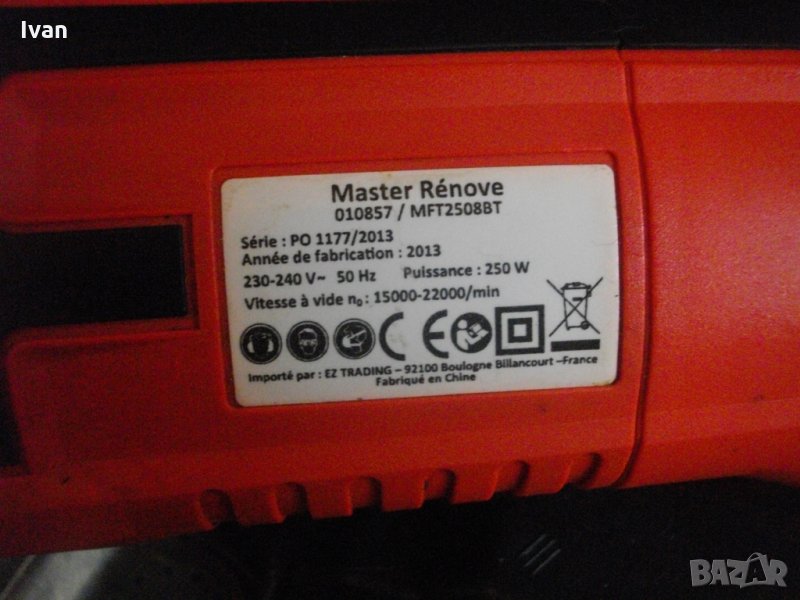 НАЛИЧЕН - ЦЕНА 199 ЛВ (101.75 €) - 250 ВАТА. Описание на червен реноватор - мултиинструмент - комплект - 250 вата. Съвсем нов силен и мощен реноватор-мултиинструмент за всякакъв вид работа-рязане,подостряне,шлайфане,шлифоване,шмиргелене,и всякакви други дейности,в зависимост от поставената приставка.Машината е френска марка и лиценз,упомената на фабричният стикер,производство Китай. Марка и модел-Master Renove MFT2508BT.В отлично техническо състояние.Работи много добре,с добри трептения и вибрации на главата.Мощност на мотора-250 вата,обороти-от 15000 до 22000 в минута,регулируеми с 6 степени.Пусков горен ключ с приплъзване.Стоманена редукторна кутия с хром покритие.Глава стандартна за шестограм ключ.Главата е универсална,с 4 закрепващи приставката метални кръгли зъбчета.Към машината има оригинален ключ за главата-шестенен и 1 брой нова оригинална приставка-нож за рязане на дърво и пластика.Комплекта е прибран в оригиналният си твърдосплавен пластмасов куфар с дръжка.Към машината и ма и оригинален накрайник-конектор на отпадъчен прах,със захват към корпуса на главата,показан на последната снимка.