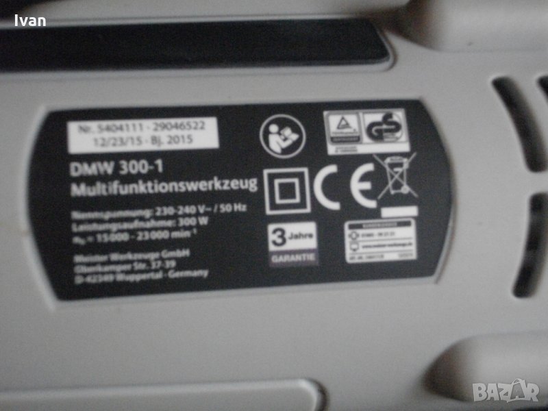 (101.75 €)Описание на сив немски 300 вата. НЕ Е НАЛИЧЕН.Съвсем нов хипер мощен мулти инструмент-реноватор,професионален модел на дуро.Немско оригинално производство,упоменато на фабричните стикери. Марка и модел-Duro Pro DMW 300-1 Multifunktionswerkzeug.Машината е в отлично техническо състояние.Работи много добре-силно,мощно и високоефективно чрез трептения и ротационни вибрации.Мощност-300 вата,обороти-от 15 000 до 23 000 в минута,регулируеми с 6 степени.Машината е производство месец декември 2015 година.Към нея има в комплекта оригиналният антипрахов отвеждащ филтър,който се захваща под нея при работа.1 брой приставка-неръждаваем метал,тип режещ ножьоригинална немска на мейстер.1 брой оригинална странична дръжка-твърдосплавна.1 брой оригинален шестенен ключ за главата.от хром-ванадиум.Комплекта е прибран в оригиналният си твърдосплавен пластмасов куфар с фабричното лого.Марката е дъщерна на немската Meister.