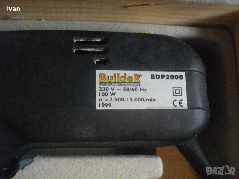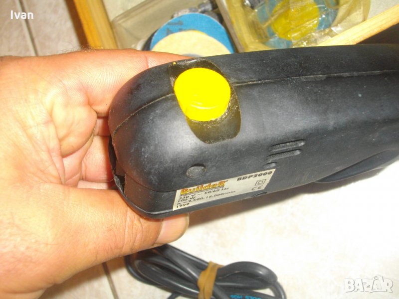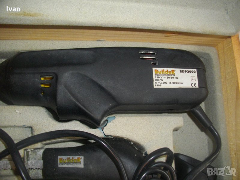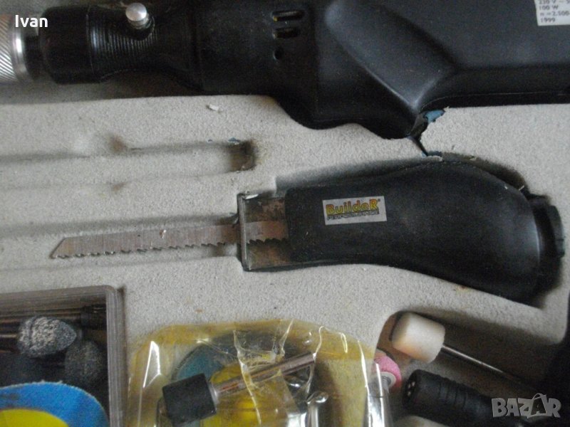 зеге с 2 режещи ножове-триони-за дърво и за метал.Приставка-Шлифовъчна плоча-кръг,твърдосплавен,с 2 сменяеми резбови глави към нея.Машината има и допълнителна дръжка за захват,снемаща се.Комплекта е немско производство. Марка и модел-Builder BDP2000.Производство 1999 година.Почти нов,много малко ползван,в отлично техническо състояние.Мощност на основната машина-100 вата,обороти от 2500 до 15 000 в минута.Регулатор на оборотите.Дължина на машината с главата-патронник-23 см.ПАТРОННИКА е за захват на аксесоар с диаметър макс ф 5мм,от 0 до 5мм,В комплекта има 2 кръгли шкурки за приставката шлифовъчна глава-платови,за дърво и метал,множество аксесоари и компоненти-бургиики,фрезери,шлифовалки.Кутията е с платова луксозна вложка.Комплекта е прибран в дървена луксозна кутия,с фини метални закопчалки.