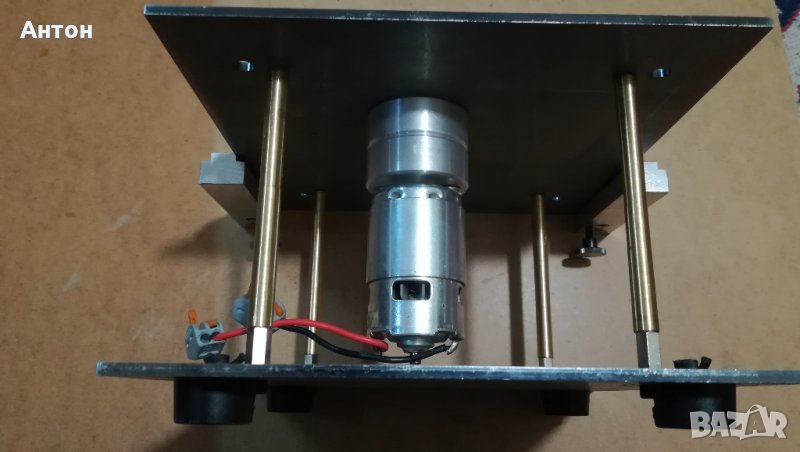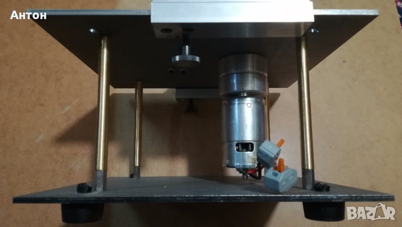 Малка машинка (подобна на оберфреза), която ми беше нужна за процепване на текстолит и други подобни материали. Сега използвам малка ЦПУ (CNC) фреза и тази не ми е нужда. Има линеал с винтове за затягане, както и цангодържач, като този на Дремел шлайфчетата. Фрезерът е със опашка 3.175. Моторчето е 18V DC от винтоверт Парксайд и може да се ползва самостоятелно като шпиндел ако е необходимо. Към него давам и резервни цанги и 2 фрезерчета като тези от снимките. Може да се използва за дървообработка, за фрезоване на малки канали в детайли, за прорязване и процепване на пластмаси, плексиглас, печатни платки (PCB) и др.