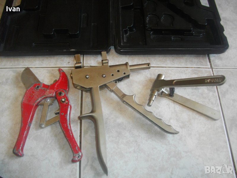 Комплекта включва Експандер клещи 12-25 за PER и PB. Също и PER клещи - плъзгащи се клещи. Налични оригиналните френски ползвани режещи ножици за ПВЦ тръби със захват до 42 мм тръба. Острието на ножиците няма никкави забележки. Изцяло са метални.