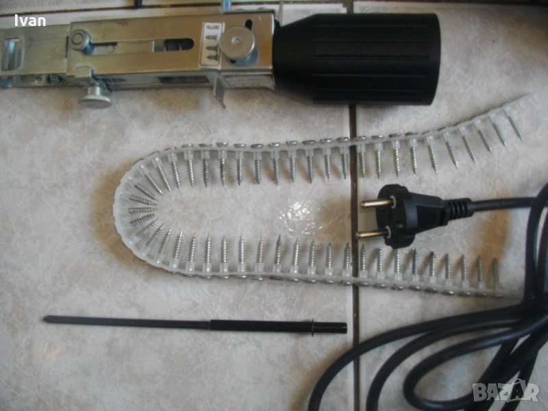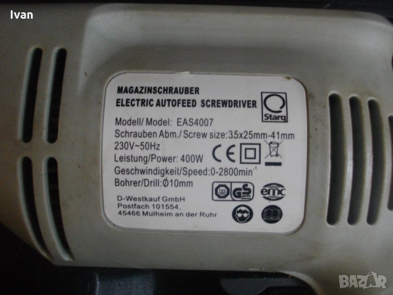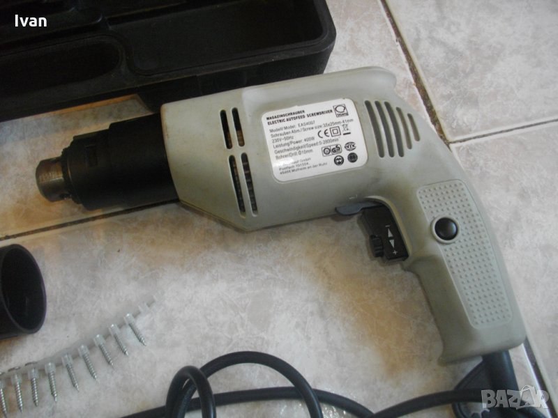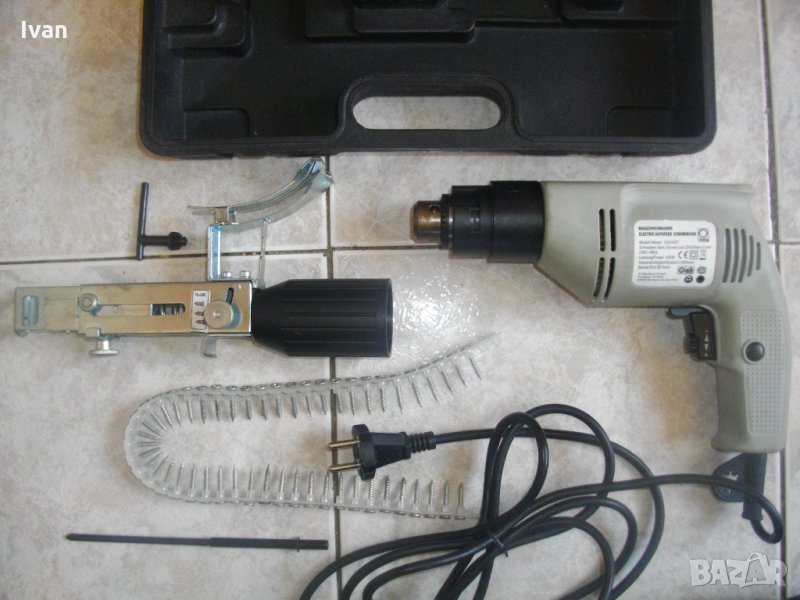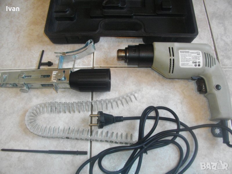 Цена 150 евро (293.37 лв.) . Съвсем нова електрическа отвертка/винтоверт с винтов магазин, за серийно завиване на винтове при сухо строителство, особено подходяща при работа с гипсокартон и в професионалното дърводелство - немски профи 400 ватов модел, с регулатор на скоростта и голям капацитет на винт - размер до 41 мм. Марка и модел на машината - Magazinschrawber Electric Autofeed Screwdriver - model EAS 4007.
