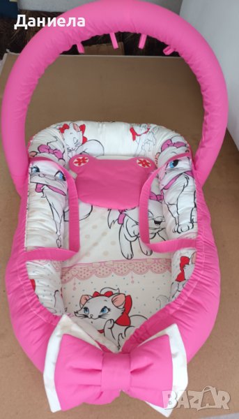 Бебешко гнездо с арка за поставяне на играчки, която се сваля. Стабилно дъно от дунапрен, облечен с вата, което се вади, за по лесно пране.Плат качествен ранфорс, пълнеж на бордовете-силиконов пух. Вътрешни размери 80/40.Изработвам по поръчка в желан десен.