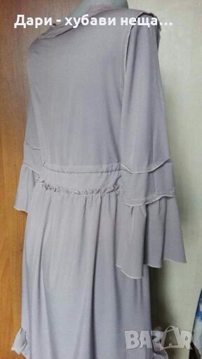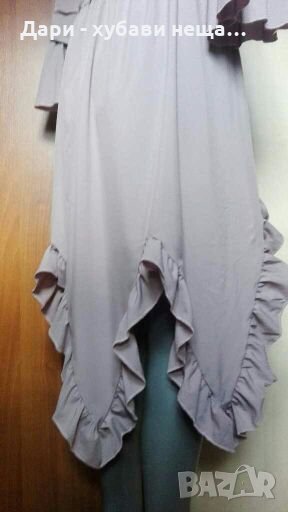 Много лека, без прозрачност и с регулиране при талията.Цветът е много красив на живо - пепел от рози(на снимките излиза като сивкав).Роклята е подходяща и за бременна жена.Може да се носи и като туника.Състояние - като нова, размер по етикет М.По-късно ще предоставя подробните размери.