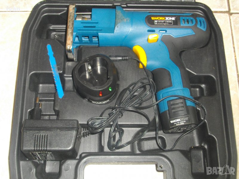10,8 волтова акумулаторно зеге-вертикален прободен трион,литий-йон технология.Професионален модел на Уоркзоне.Австрийско оригинално производство.Марка и модел-Workzone MS002,Зегето е професионално-с метални части вътре,издържащи на по-големи натоварвания.Много запазен външен вид и техническо състояние-бодито работи отлично,батерията не се зарежда.Мощност на мотора-10,8 волта,обороти-2100 в минута.Машината като размер е малка,изключително удобна за работа при трудно достъпни места.Авто защита блокировка на спусъка-шпиндел.Метална глава,система клик-клик-бърза сменяемост на ножа-с 2 движения,за режещи ножове-триони с Т образен захват.Гумирани нехлъзгащи се покрития на дръжката и корпуса.Батерия-нова,литий-йон,10,8 волтова,1,3 ампера,оригинална австрийска на маркатаБАТЕРИЯТА НЕ СЕ ЗАРЕЖДА-ОТ НЕИЗПОЛЗВАНЕ ЗАРЯДА Е ПАДНАЛ ПОД КРИТИЧЕН МИНИМУМ.Зарядно и адаптор-оригинални,литий-йон,12 волта,400 милиампера,универсални-за всички 10,8 волтови батерии от типа.Отлични.Към машината има 1 брой нов режещ нож-трион за дърво,син цвят-австрийски.Комплекта е прибран в оригиналният си твърдосплавен куфар с фабричното лого.
