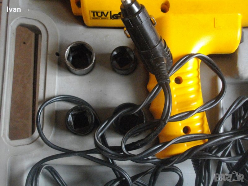 Описание на жълт гайковерт - комплект - куфар-вложки-цена 199лв. НЕ Е НАЛИЧЕН. Почти нов силен и мощен гайковерт,работещ на захранване 12 волта до 14,2 волта,с захранващ кабел 5 метра,включващ се към запалката на автомобил,камион.Корейско оригинално производство,1998 година. Марка и модел-Intrimex JJ100.Машината е стояла,ползвана е съвсем малко,не е работено с нея интензивно.Мощност на мотора-200 вата,15 ампера.Удобен реверс смяна посока-дясно-ляво.Голям удобен спусък.Корпус-твърдосплавна труднозапалима бакелитова пластмаса.Към машината има 4 броя втулки-камъни,от хром-ванадиум.размери от 14 до 21 мм.Комплекта е прибран в оригиналният си твърдосплавен куфар с оригинална вложка.