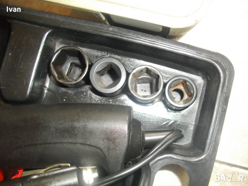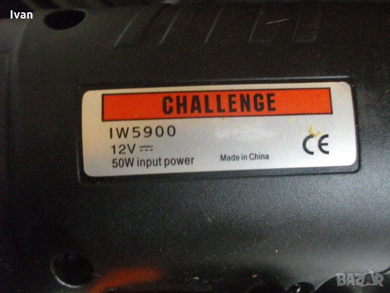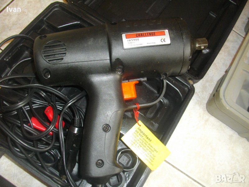 Описание на черен гайковерт - комплект. Цена 159лв. НАЛИЧЕН.Съвсем нов силен и мощен гайковерт-с размер на квадрата за камъни-1/2.Английска марка и лиценз,производство-базирано в Китай. Марка и модел на машината-Challenge IW5900.Пълен комплект,в отлично техническо състояние.Работи много добре.Силен,мощен,ефективен.Мощност на мотора-12 волта,50 вата.Реверс смяна посока.Плавен старт на спусъка-шпиндел.Светлинен Лед прожектор-просветка.Вграден кабел около 5 метра дължина със завършващ накрайник-букса за включване към запалката на автомобил,камион.Отделно има и накрайник за включване към клемите на акумулатор.В комплекта има и 4 броя камъни-накрайници,от хром-ванадиум,размери-17мм-19мм-21мм-23мм.Комплекта е прибран в оригиналният си твърдосплавен пластмасов куфар с фабричното лого.