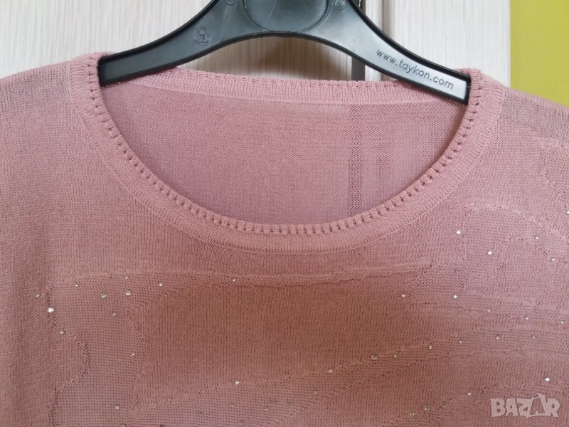 Дамска тънка трикотажна блуза с къс ръкав, розово лилава на цвят, с лъскави камъчета по фигурките отпред, размер М-Л, рамене 40 см, бюст 54 см /108 см обиколка/, дължина 60 см, ръкав 28 см. Блузката е като нова, обличана еднократно. Отговарям на съобщения тук, изпращам с куриер или лично предаване в София.