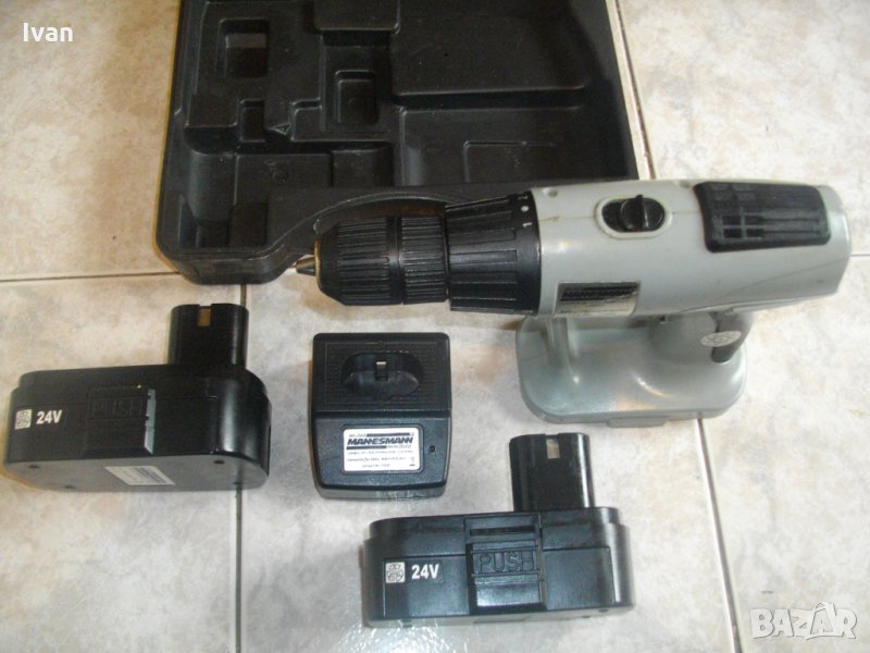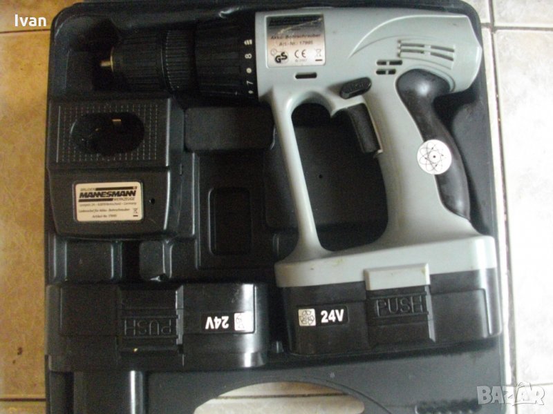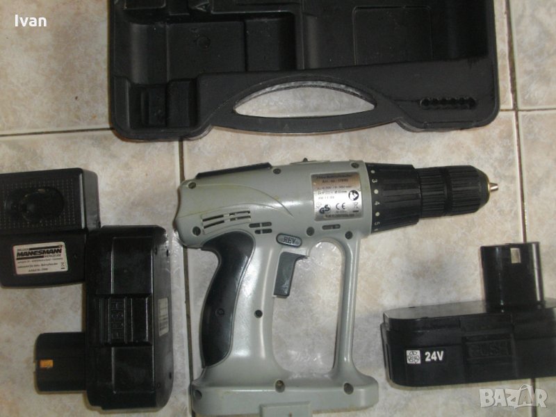 Описание на 24 волта винтоверт немски Манесмън. Цена на комплекта - 89 лв. Мощен и силен винтоверт-дрелка, ударна бормашина.Немско производство на Akku. Комплекта е с много запазен външен вид и техн.състояние - боди о-тлично работи, кутия на зарядното - 24 волта -отлична.АДАПТЕР КЪМ КУТИЯТА НА ЗАРЯДНОТО - ЛИПСВА. ДВЕ БАТЕРИИ -ЕДНАТА СЕ ЗАРЕЖДА, ДЪРЖИ ЗАРЯД, ДРУГАТА - НЕ СЕ ЗАРЕЖДА.