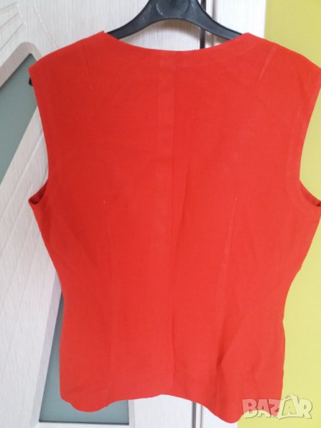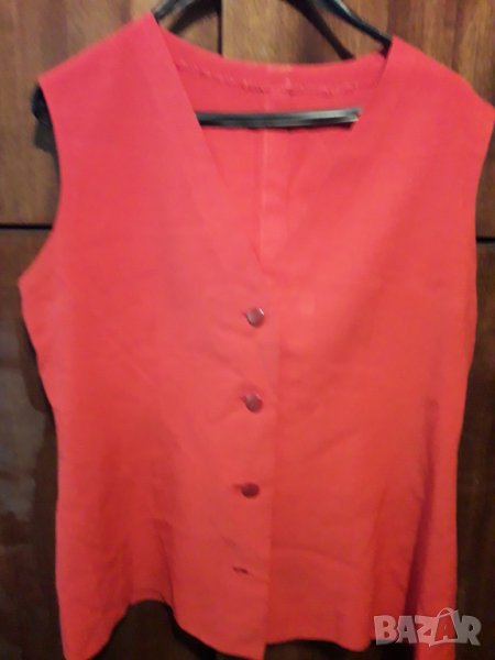 Дамска блуза с копчета без ръкав, ярко червена на цвят, Размер L, рамене 40 см, бюст 48 см /96 см обиколка/, талия 44 см /88 см обиколка/, ханш 52 см /104 см обиколка/, дължина - 58 см. Блузата е много запазена, но съм изгубила най-долното копче, може да се сменят копчетата. Отговарям на съобщения тук, изпращам с куриер с отстъпка, преглед и тест, или лично предаване в София.