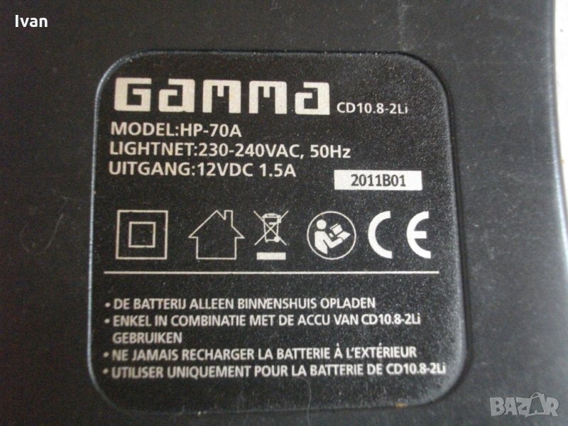 Einhell-CMI,и някои други с три букси,на които символа ,,Т" е между плюса и минуса,тип триъгълна кутия.Зарядното е оригинално холандско производство,упоменато на него,внос Англия.Gamma HP70A.Производство-2011г.Характеристики-50 херца,евро щепсел,12 волта,1,5 ампера,2 светлинни индикации.За батерии 10,8 волта-литий-йон елементи.