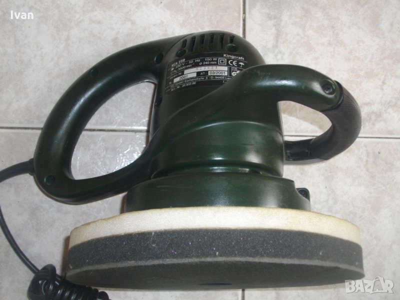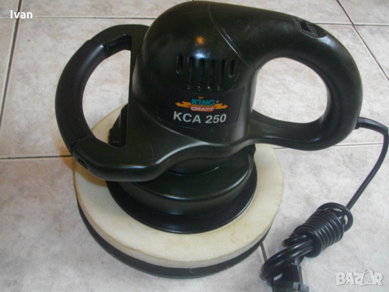 Описание на тъмно зелена нова 150 вата, немска машина - King Craft KCA 250. Качествена полир пастир машина за полиране и пастиране на автомобили,стъкла,ламинати,мебели и всякакви други твърди повърхности.Машината е немско оригинално професионално производство.Марка и модел-King Craft KCA 250. Нова е - не е работено с нея,отлично техническо състояние-работи много добре-силно,мощно и ефективно.Много е бърза.Мощност на мотора-150 вата,обороти-3500 в минута.Здрава и корава твърдосплавна дредна дръжка,релефна нехлъзгаща се.Удобен горен пусков ключ.Корпес-твърдосплавна бакелитова пластмаса.Работен плот-пита,размер-ф240мм.Дебелина-38мм.Плота при работа се върти с приплъзване еднопосочно,не е както при по-обикновенните подобни машини.Машината е без кече и без фабричната си опаковка.Професионален модел е поради мощността си и приплъзващото движение на плота.