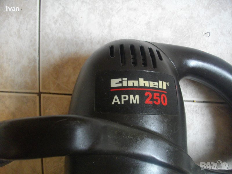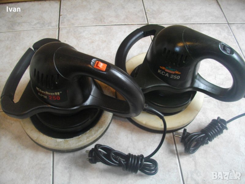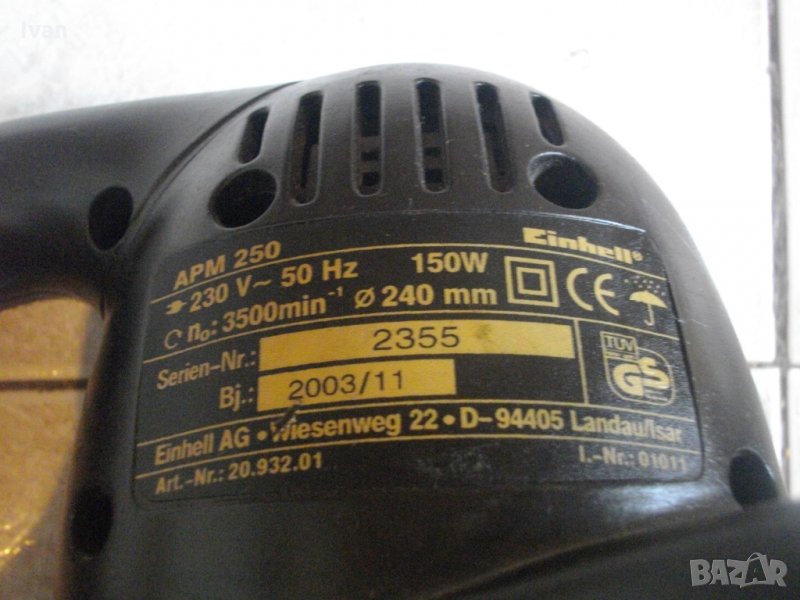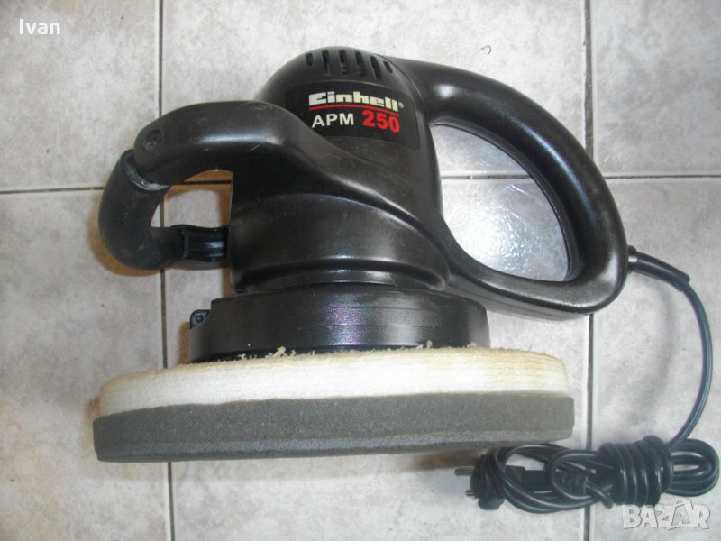 Хипер силна и мощна 150 ватова ел.полираща и пастираща машина,модел на Айнхел.Немско оригинално производство 2003 година. Марка и модел-Einhell APM 250.Машината е за полиране и пастиране на амтомобили,стъкла,ламинати,мебели и всякакви други твърди повърхности.Запазен външен вид,и отлично техническо състояние.Работи много добре-силно,мощно,бързо и ефективно при работа.Мощност на мотора-150 вата,обороти-3500 в минута.Голям масивен плот-пита,размер ф240мм-стандартен,универсален.Отдолу е подплатен с инпрегнирано гумирано покритие.Предна масивна широка и много удобна дръжка
