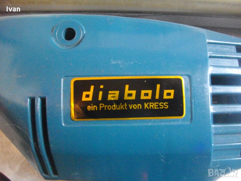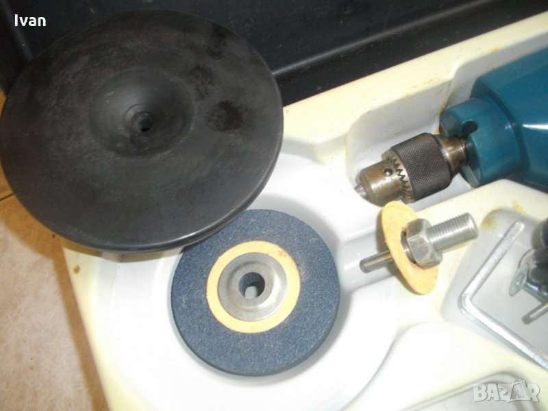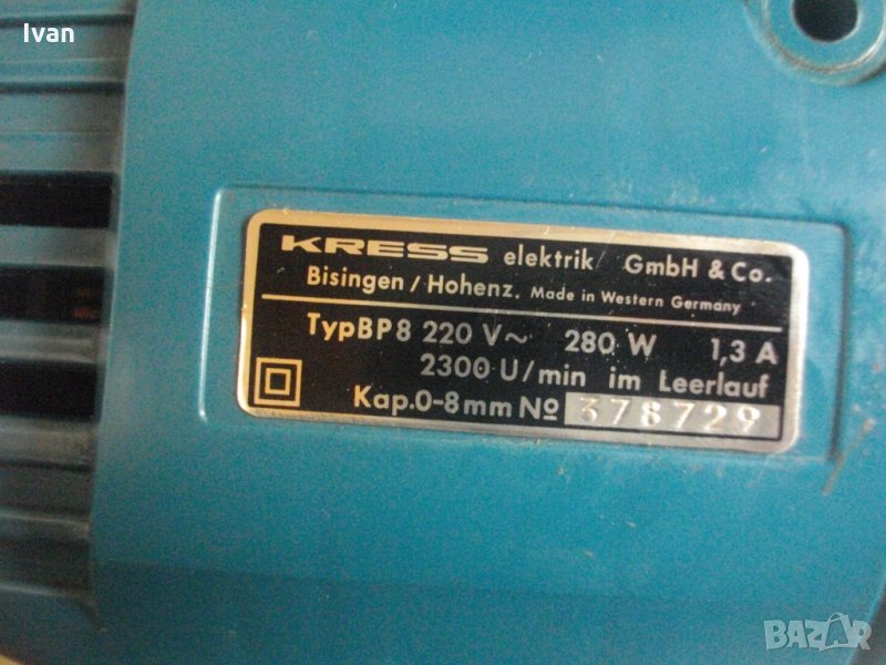 Съвсем нов професионален комплект-машина 3 в 1-висококачествен продукт на Крес.Старо надеждно и луксозно немско оригинално производство. Марка и модел-diabolo von Kress-Kress Elek BP8trik.В отлично техническо състояние.Работи много добре,включително и всички приставки.Основна машина-бормашина.Мощност на мотора-280 вата,1,3 ампера.2300 оборота в минута.Патронник-метален,за клюм,от 0 до 8мм.Автостоп блокировъчна защита на спусъка-шпиндел.Корпус-старата твърдосплавна висококачествена бакелитова пластмаса.Двустранна възможност за странична дръжка.Приставки в комплекта-голяма полир пастираща гумена приставка-диаметър ф125мм,2 броя нови оригинални камъни-дискове за