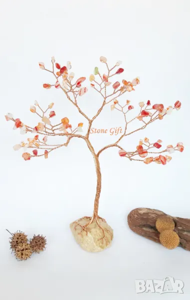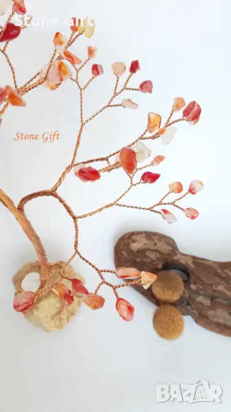 За това дръвче съм използвала Камъни от Карнеол, медна тел и естествен камък за основа. Дръвчето е високо 25 см., 20 см. широко и 16 см. дълбоко.