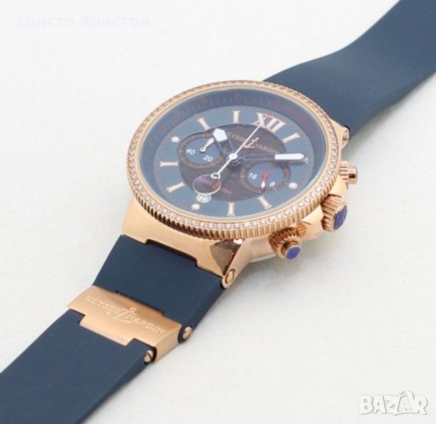 Ulysse Nardin Marine, кварц, хронограф, полиран стоманен корпус розово злато, ринг с камъни, ефектен син циферблат с дата в позиция 6 часа, фосфоресциращи стрелки, римски цифри и синя каучукова каишка.